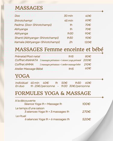 Massage ou Yoga (sauf forfait) à -15% sur les tarifs ci-dessous.